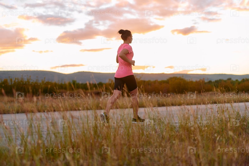 Решительный спортсмен бежит под солнцем на фоне прекрасной природы