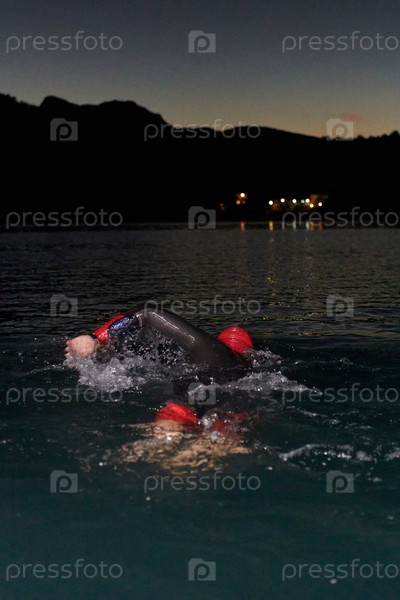 Целеустремленный профессиональный триатлонист проходит интенсивные ночные тренировки в холодной воде, демонстрируя самоотверженность и выносливость в рамках подготовки к предстоящим соревнованиям по триатлону