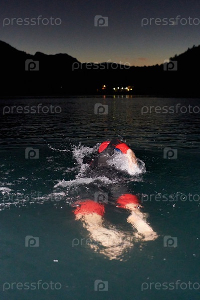 Целеустремленный профессиональный триатлонист проходит интенсивные ночные тренировки в холодной воде, демонстрируя самоотверженность и выносливость в рамках подготовки к предстоящим соревнованиям по триатлону