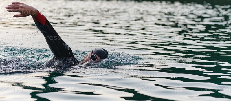 Профессиональный триатлонист с непоколебимой самоотдачей тренируется перед предстоящими соревнованиями на озере, излучая чувство атлетизма и глубокую приверженность совершенству