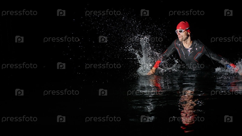 Целеустремленный профессиональный триатлонист проходит интенсивные ночные тренировки в холодной воде, демонстрируя самоотверженность и выносливость в рамках подготовки к предстоящим соревнованиям по триатлону