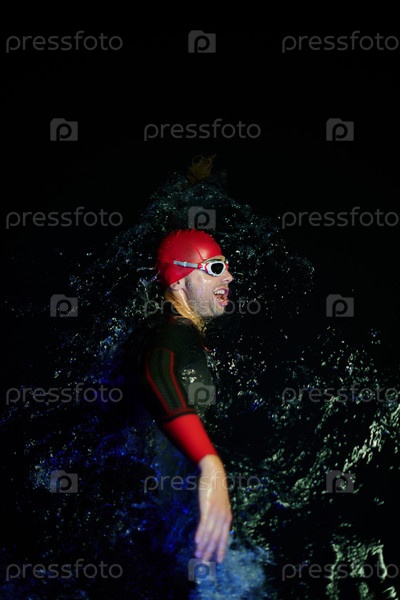 Настоящий пловец-триатлонист отдыхает во время интенсивной тренировки под ночным неоновым гелем