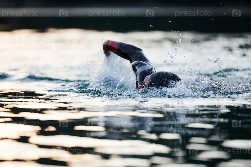 Триатлонист плывет по озеру на рассвете в гидрокостюме