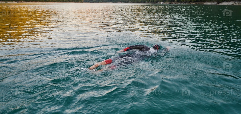 Триатлонист плывет по озеру на рассвете в гидрокостюме