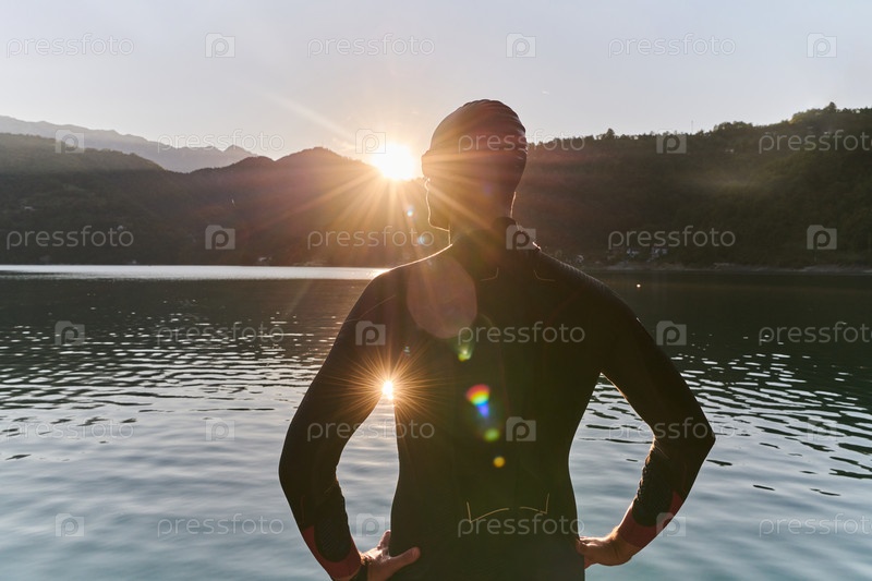 Настоящий триатлонист готовится к тренировке по плаванию на озере