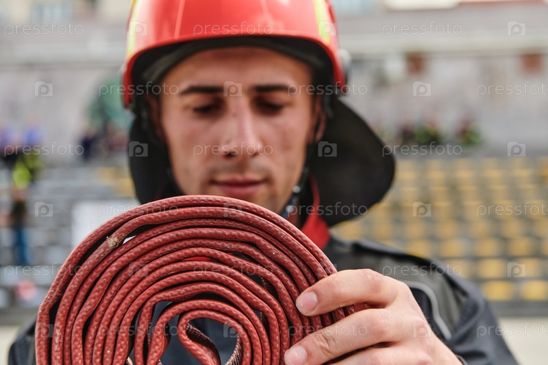 Профессиональный пожарный очищает пожарный шланг после тушения пожара