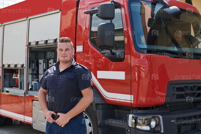 Уверенный в себе пожарный позирует перед современной пожарной машиной, демонстрируя гордость, силу и готовность к реагированию на чрезвычайные ситуации
