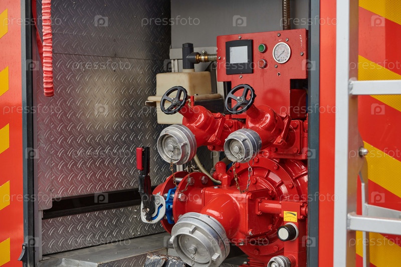 Крупный план основного противопожарного оборудования на современной пожарной машине, демонстрирующий инструменты и снаряжение, готовые к экстренному реагированию на опасные пожары