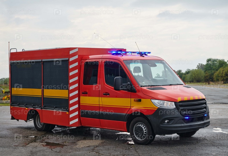 Современная пожарная машина, оснащенная передовыми спасательными технологиями, с опытной пожарной командой, готовой вмешаться и быстро отреагировать на чрезвычайные ситуации, обеспечивая безопасность и защиту общества