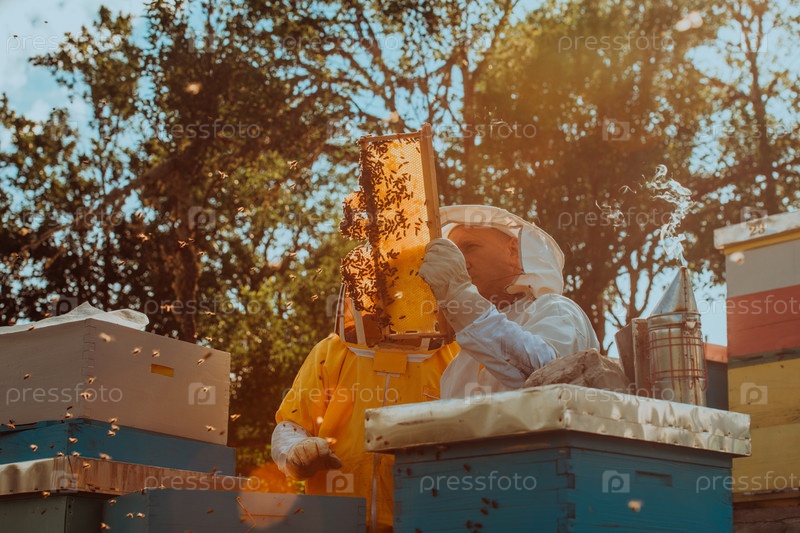 Пчеловоды проверяют мед на рамке улья в поле. Владельцы малого бизнеса на пасеке. Производитель натуральной здоровой пищи работает с пчелами и ульями на пасеке