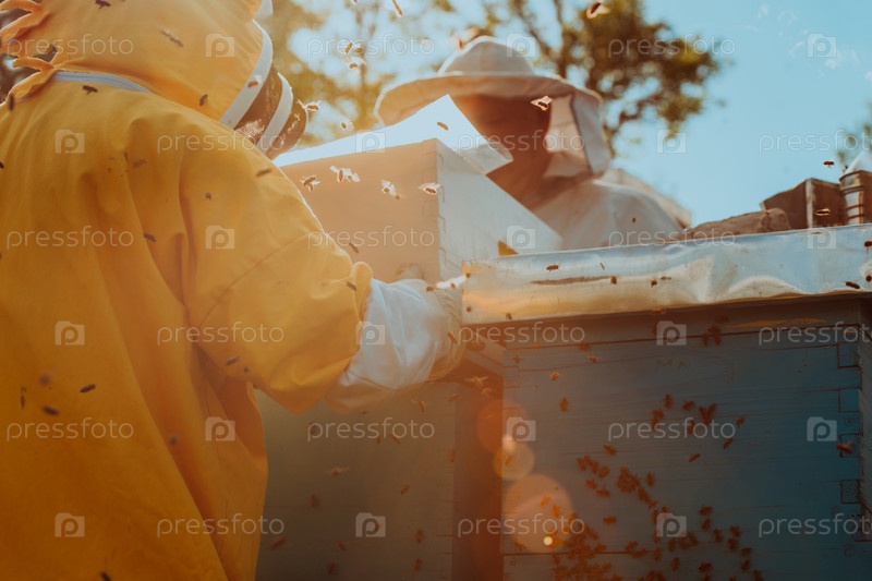 Пчеловоды проверяют мед на рамке улья в поле. Владельцы малого бизнеса на пасеке. Производитель натуральной здоровой пищи работает с пчелами и ульями на пасеке