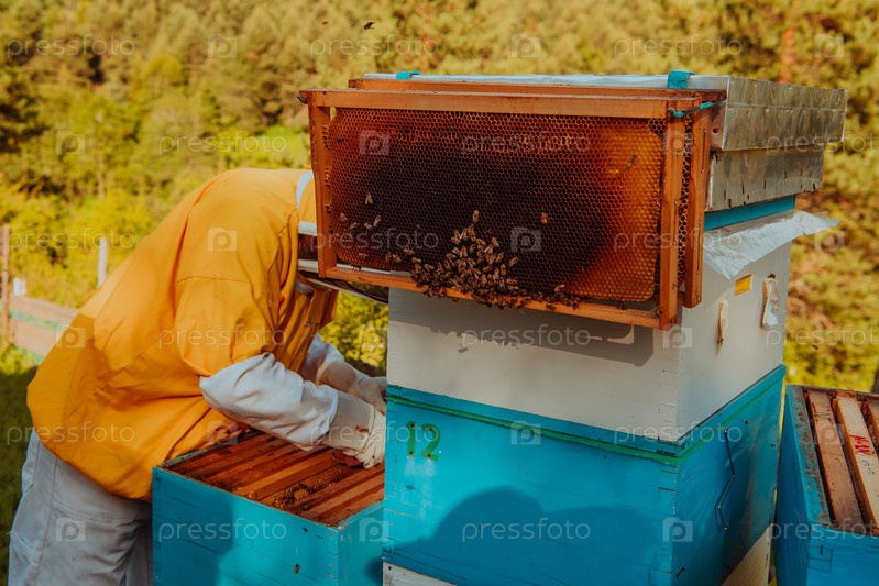 Пчеловод проверяет мед на рамке улья в поле. Пчеловод на пасеке. Пчеловод работает с пчелами и ульями на пасеке