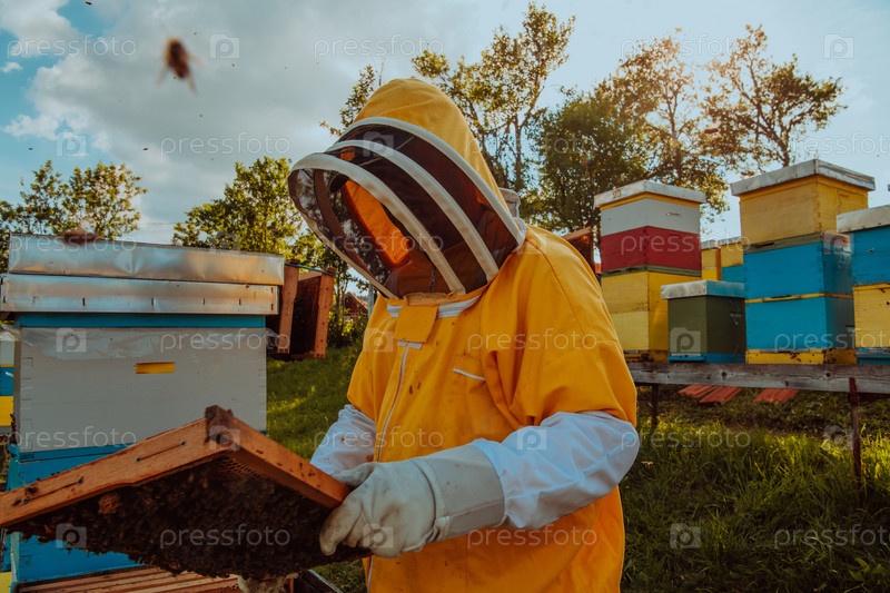 Пчеловод проверяет мед на рамке улья в поле. Владелец малого бизнеса на пасеке. Производитель натуральной здоровой пищи работает с пчелами и ульями на пасеке