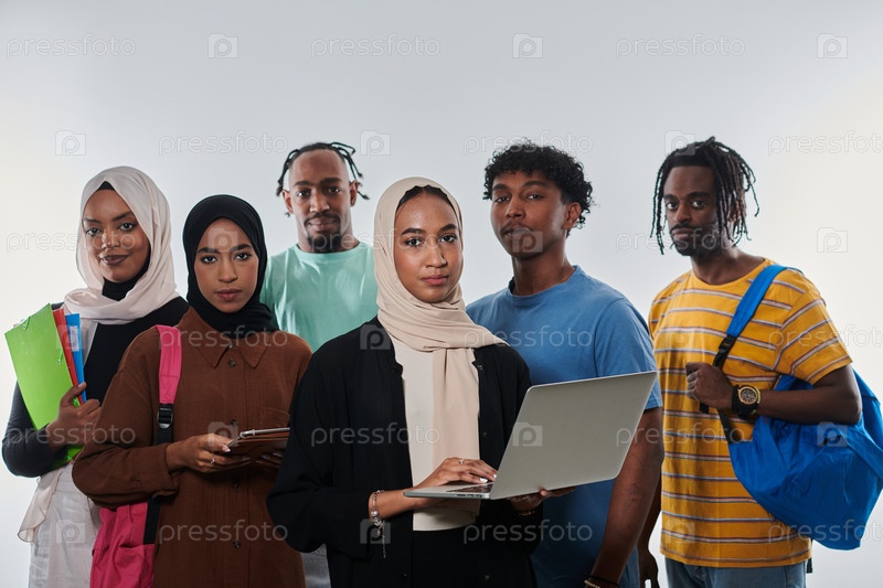 Группа разнообразных студентов занимается современными образовательными практиками, используя разнообразные технологические инструменты, такие как ноутбуки, планшеты и смартфоны, на чистом белом фоне, демонстрируя современный подход к совместному обучению