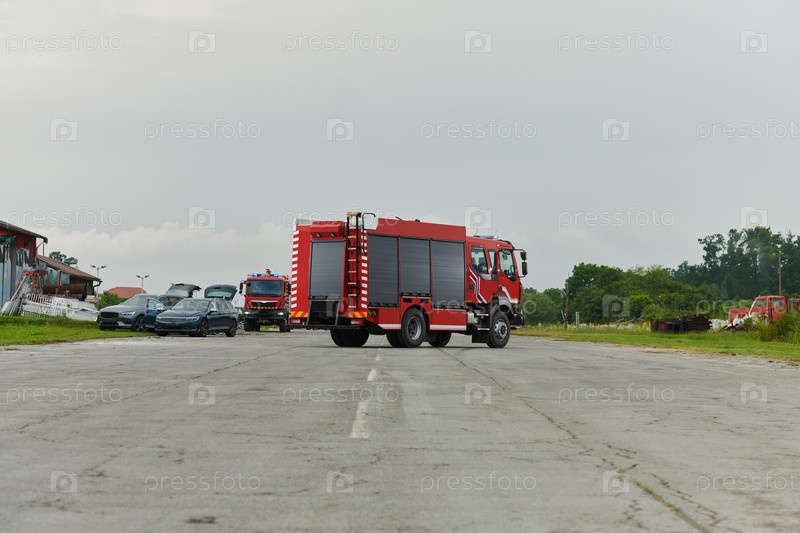 В этой захватывающей сцене современная пожарная машина, оснащенная передовыми спасательными технологиями, стоит наготове вместе со своей опытной пожарной командой, готовой вмешаться и быстро отреагировать на чрезвычайные ситуации, обеспечивая безопасность