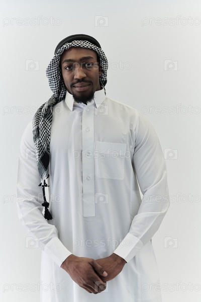 Арабский предприниматель запечатлел автопортрет на изолированном белом фоне, излучая амбиции, решимость и корпоративную харизму, воплощая сущность успешного и влиятельного бизнес-лидера