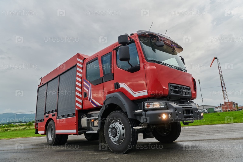 В этой захватывающей сцене современная пожарная машина, оснащенная передовыми спасательными технологиями, стоит наготове вместе со своей опытной пожарной командой, готовой вмешаться и быстро отреагировать на чрезвычайные ситуации, обеспечивая безопасность