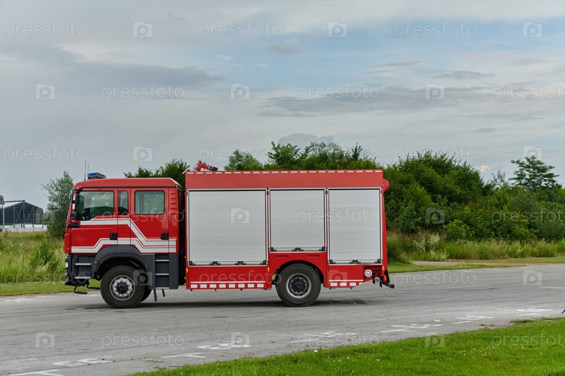 В этой захватывающей сцене современная пожарная машина, оснащенная передовыми спасательными технологиями, стоит наготове вместе со своей опытной пожарной командой, готовой вмешаться и быстро отреагировать на чрезвычайные ситуации, обеспечивая безопасность