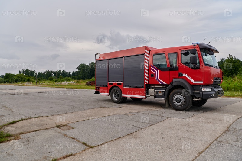 В этой захватывающей сцене современная пожарная машина, оснащенная передовыми спасательными технологиями, стоит наготове вместе со своей опытной пожарной командой, готовой вмешаться и быстро отреагировать на чрезвычайные ситуации, обеспечивая безопасность