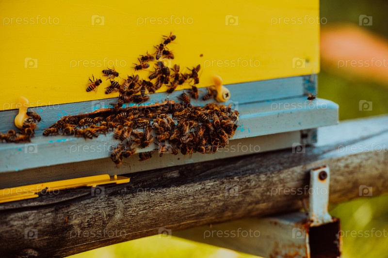 Фотография крупным планом пчел, кружащих вокруг улья и переносящих пыльцу