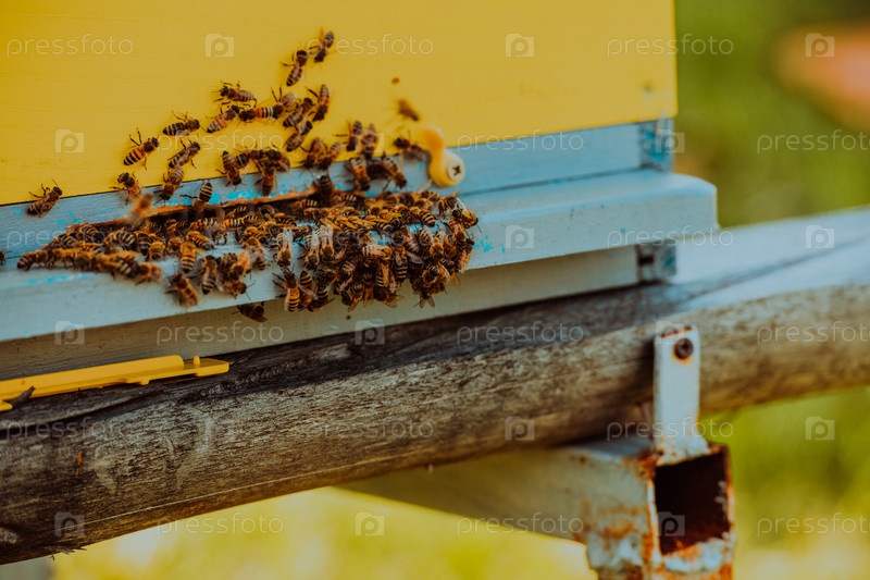 Фотография крупным планом пчел, кружащих вокруг улья и переносящих пыльцу