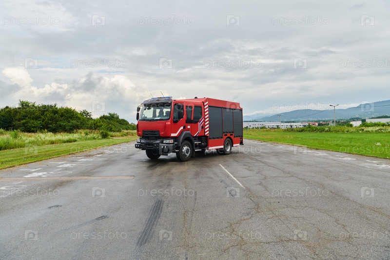 В этой захватывающей сцене современная пожарная машина, оснащенная передовыми спасательными технологиями, стоит наготове вместе со своей опытной пожарной командой, готовой вмешаться и быстро отреагировать на чрезвычайные ситуации, обеспечивая безопасность