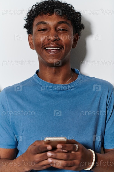 Афроамериканский подросток использует свой смартфон на чистом белом фоне, воплощая суть современной цифровой связи и молодежной культуры