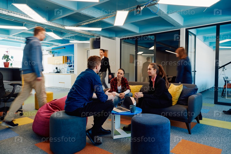 Многонациональная команда стартапа на встрече в современном ярком офисе коворкинга с открытым пространством. Мозговой штурм, работа на ноутбуке. Группа коллег, гуляющих в размытом движении