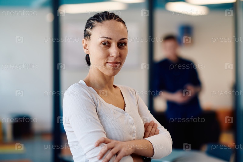 Портрет деловой женщины в креативном открытом пространстве коворкинга стартап-офиса со скрещенными руками. Успешная бизнес-леди стоит в офисе с копирайтом. На заднем плане работают коллеги