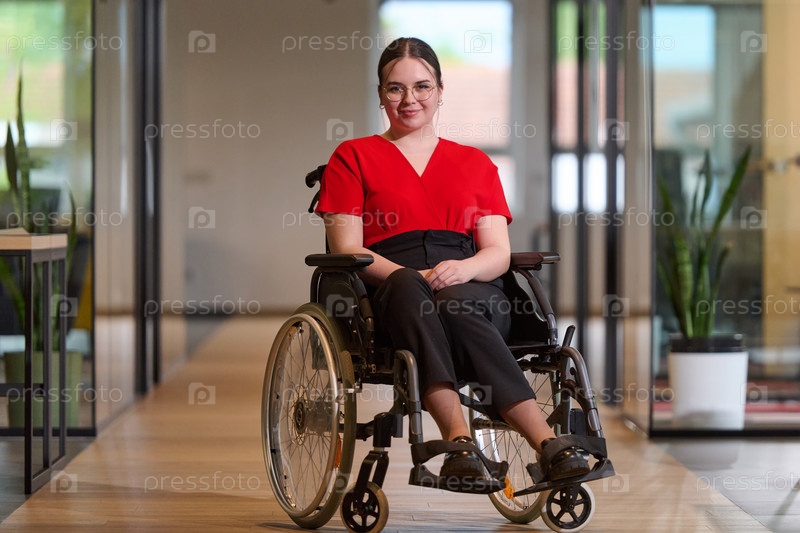 Современная молодая бизнес-леди в инвалидной коляске окружена инклюзивным рабочим пространством с офисами со стеклянными стенами, олицетворяющими решимость и инновации в деловом мире