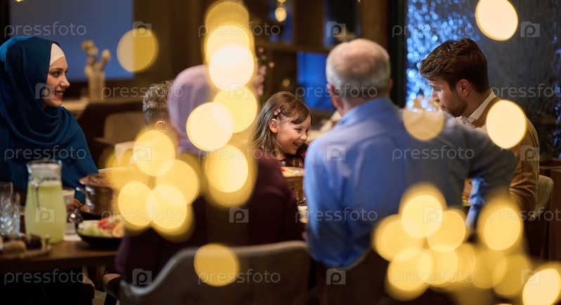 Современная и традиционная европейская исламская семья собирается вместе на ифтар в современном ресторане во время поста Рамадан, воплощая культурную гармонию и семейное единство на фоне кулинарного праздника разнообразия