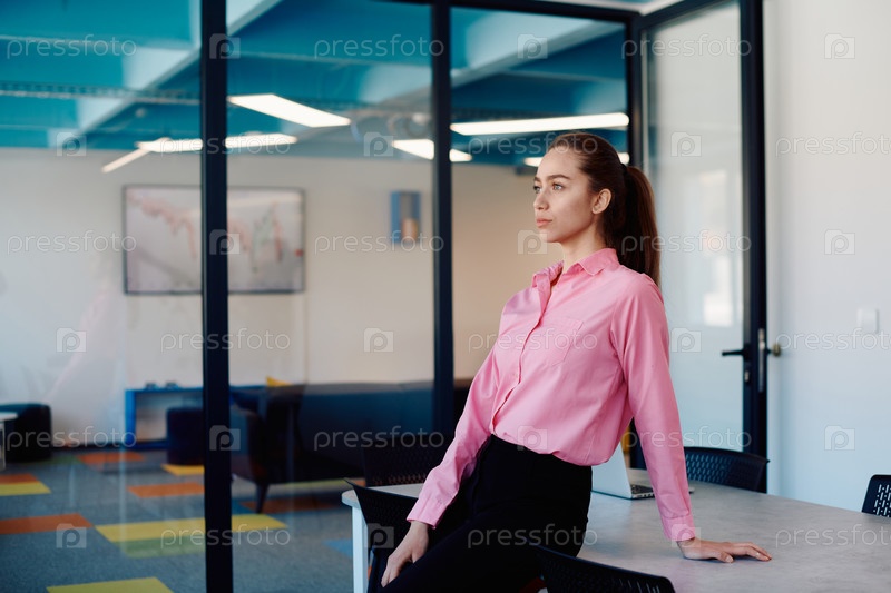Портрет молодой улыбающейся деловой женщины в креативном открытом пространстве коворкинга стартап-офиса. Успешная бизнес-леди стоит в офисе с копирайтом. Коллеги, работающие на заднем плане
