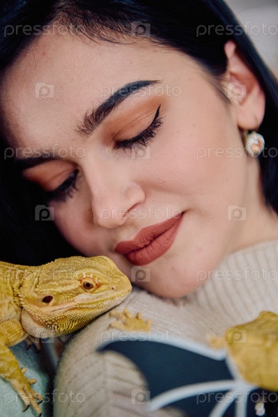 Красивая женщина позирует со своими очаровательными питомцами — бородатыми агамами