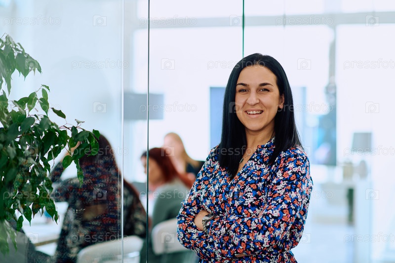 Портрет уверенной в себе деловой женщины со скрещенными руками в офисной обстановке