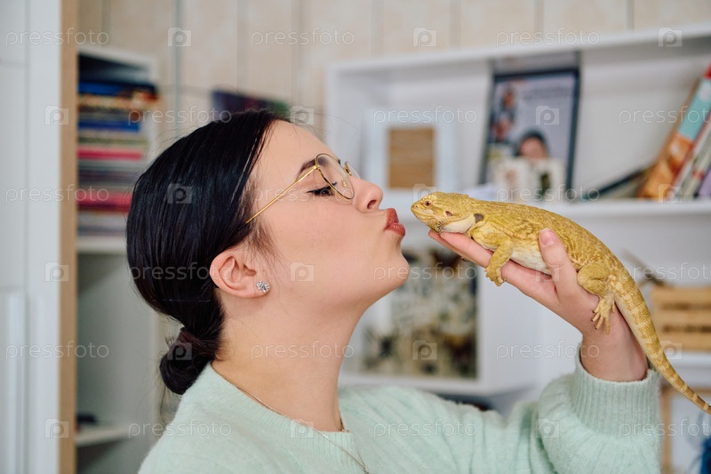 Красивая женщина позирует со своими очаровательными питомцами — бородатыми агамами