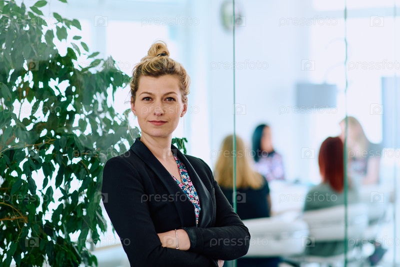 Брюнетка-бизнесвумен со скрещенными руками стоит перед современным офисом