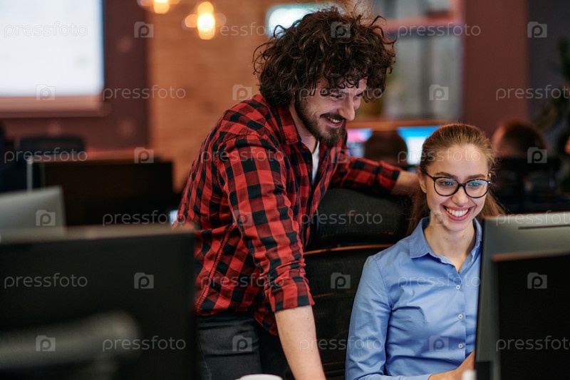 Коллеги по бизнесу, мужчина и женщина, обсуждают бизнес-стратегии, внимательно глядя на монитор компьютера, олицетворяя сотрудничество и инновации