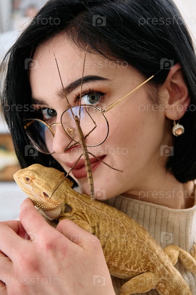 Женщина и ее питомцы: бородатая агама и палочник