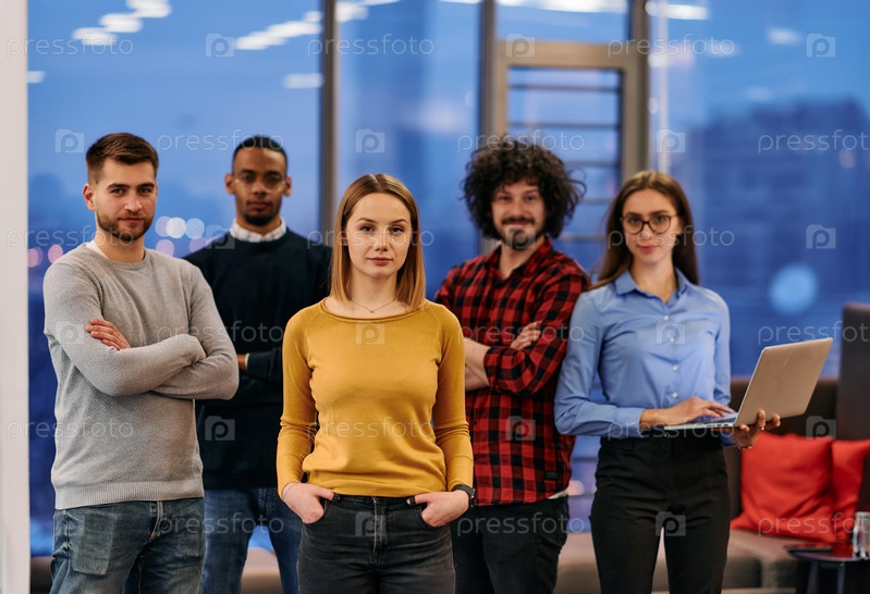 Портрет успешной творческой бизнес-команды, смотрящей в камеру и улыбающейся. Разнообразные деловые люди, стоящие вместе на старте. Избирательный фокус
