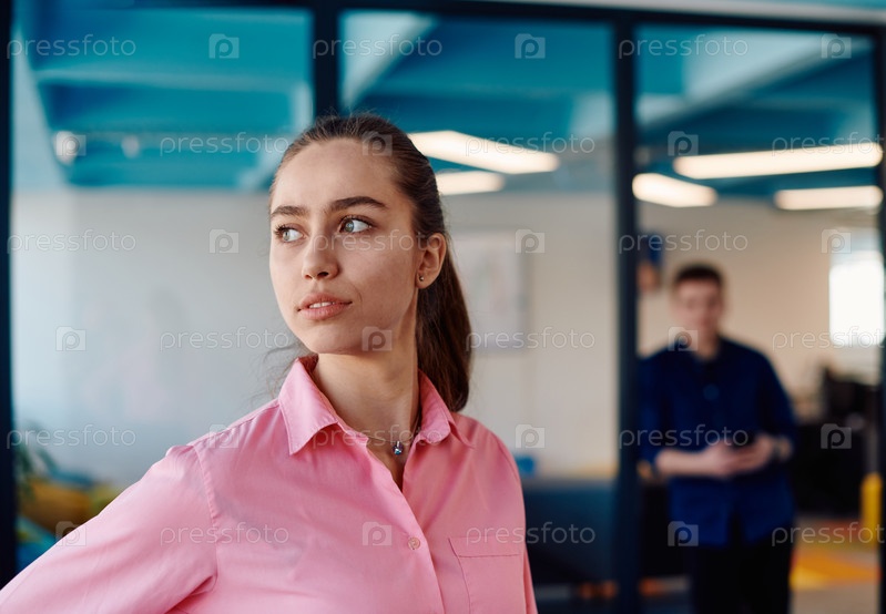 Портрет молодой улыбающейся деловой женщины в креативном открытом пространстве коворкинга стартап-офиса. Успешная бизнес-леди стоит в офисе с копирайтом. Коллеги, работающие на заднем плане