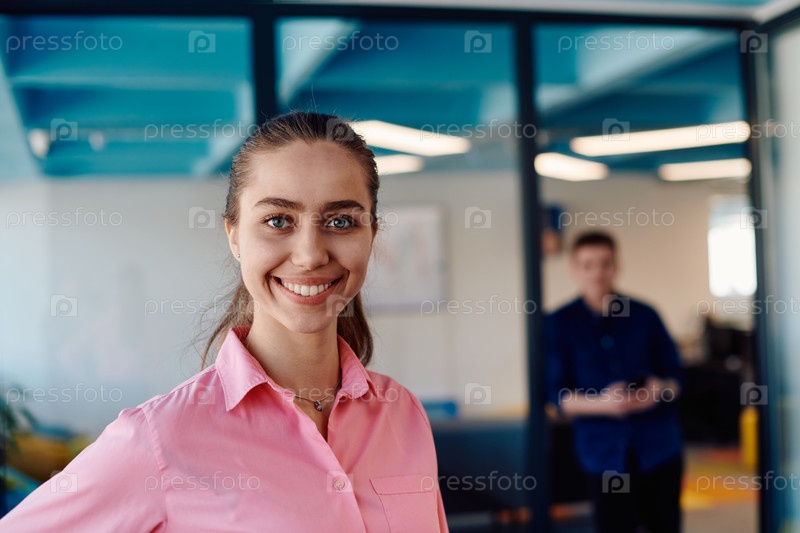 Портрет молодой улыбающейся деловой женщины в креативном открытом пространстве коворкинга стартап-офиса. Успешная бизнес-леди стоит в офисе с копирайтом. Коллеги, работающие на заднем плане