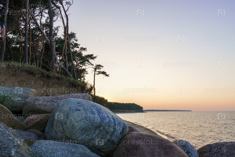 Закат над морем. Отражение солнечного света в морских волнах. Валуны, скалы на берегу. Небо в лучах заката. Балтийское море