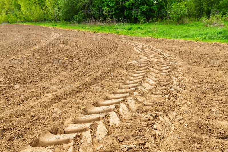 Вспаханное поле. Сельскохозяйственная земля. Тракторные следы