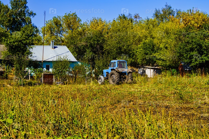 Сельский пейзаж. Трактор косит ботву. Поселок Красная Заря. Орловская область