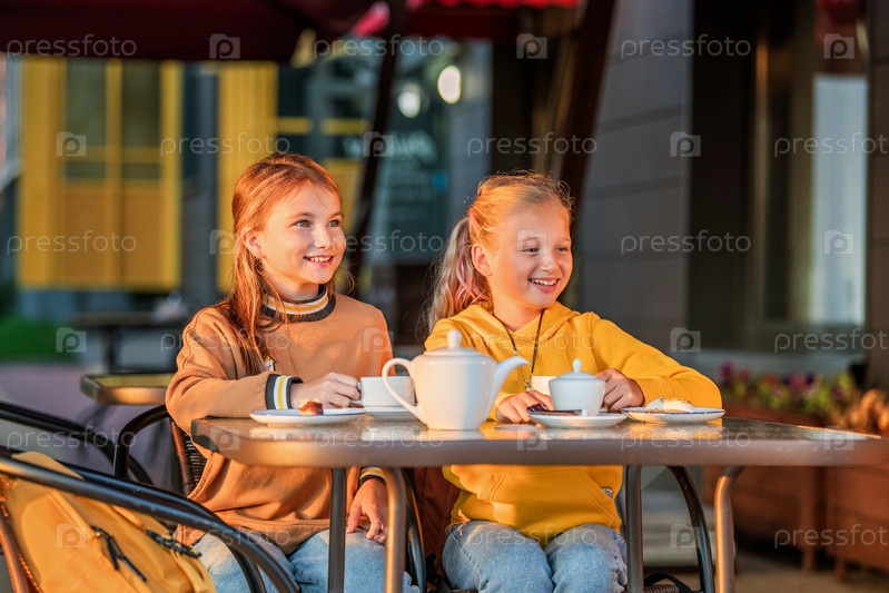 Две школьницы сидят за столиком в городском летнем кафе и пьют кофе и чай со сладостями