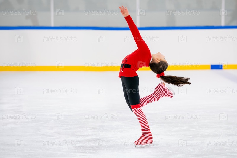 Маленькая девочка-фигуристка в костюме Санта-Клауса катается на льду крытой арены. Рождественский праздник для спортсменов