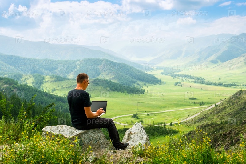 Мужчина-фрилансер-путешественник, работающий удаленно на ноутбуке и наслаждающийся видом на горы