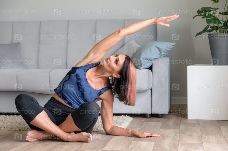Вид спереди на стройную женщину среднего возраста, занимающуюся йогой дома в гостиной