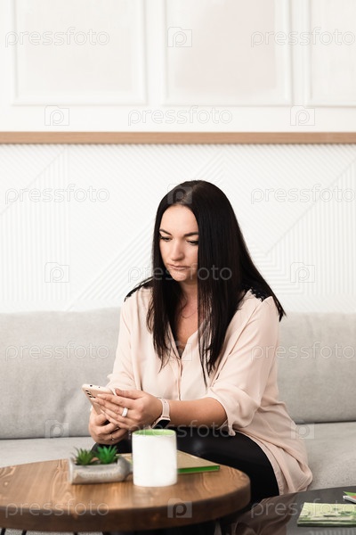 Девушка в офисе пишет сообщение на своем смартфоне