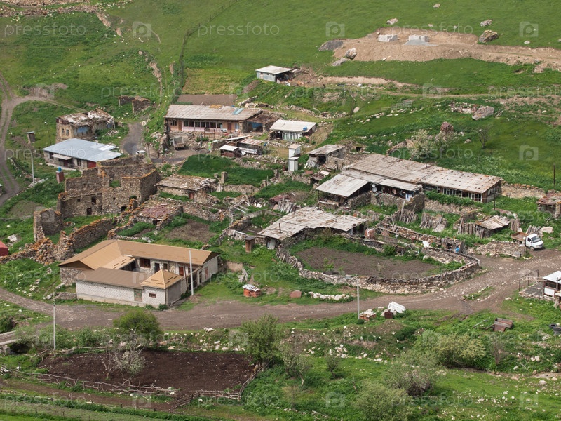 Вид сверху на осетинское село Галиат в Кавказских горах, Республика Северная Осетия - Алания, Россия